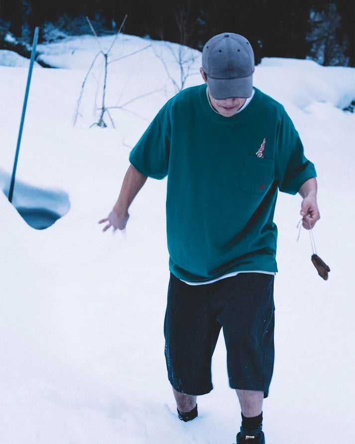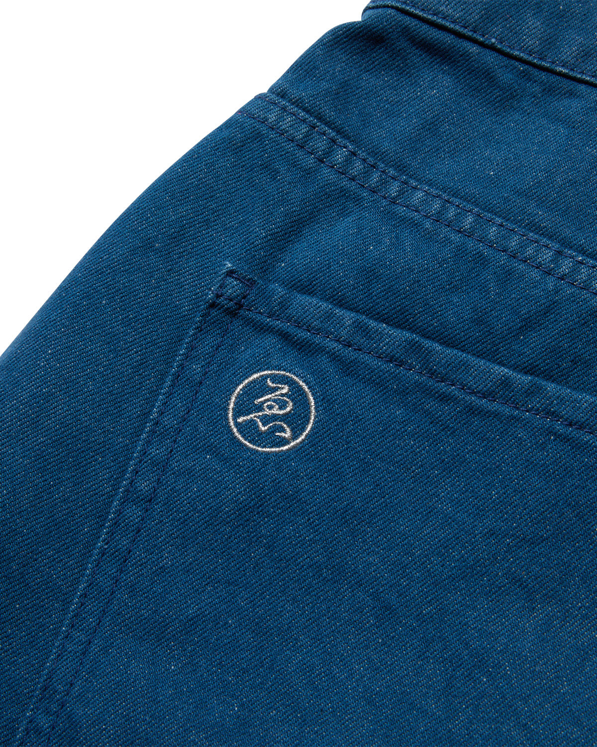 These relaxed-fit denim shorts are made from lightweight 100% cotton and styled in a classic five-pocket design. They feature sushi embroidery on the coin pocket, a silver “ゑ” logo on the back left, and a leatherette patch above the right back pocket. The waistband includes an internal drawcord for adjustable comfort